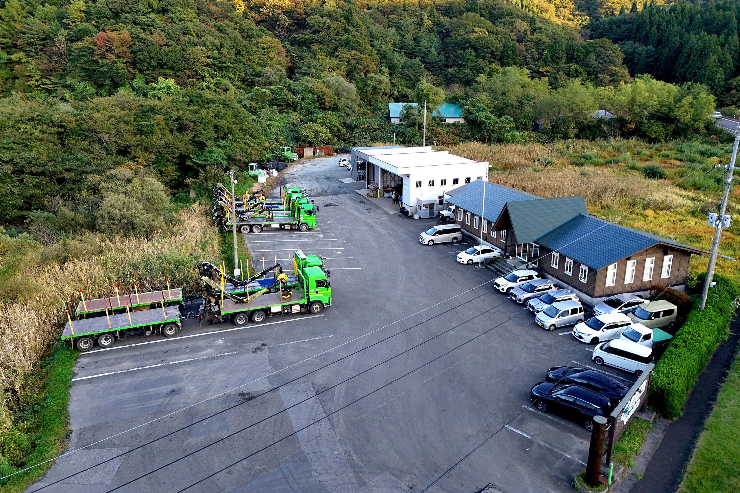 当社の林業サービスは、「伐って、使って、植えて、育てる」循環型林業を実践。原木の伐採・集材・搬出には高性能林業機械と輸送ノウハウを活用し、さらに国内外への販路と物流を組み合わせた一貫物流サービスを強みとしています。また森林オーナー様に対しては、山林管理の代行や立木買取にも対応。需要家向けには原木情報をタイムリーに提供し、国産材の循環物流を支えています。また、日本一の製材メーカーの中国木材能代工場の構内で原木の選木業務も請け負い、木材供給の現場を支えています。
